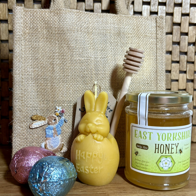 Jute gift bag with decorative Easter Bunny patch sewn on the front.